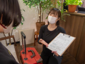 カウンセリングシートにご記入いただきながら簡単なカウンセリングやお会計、施術の際のお着がえなどをご用意させていただきます。