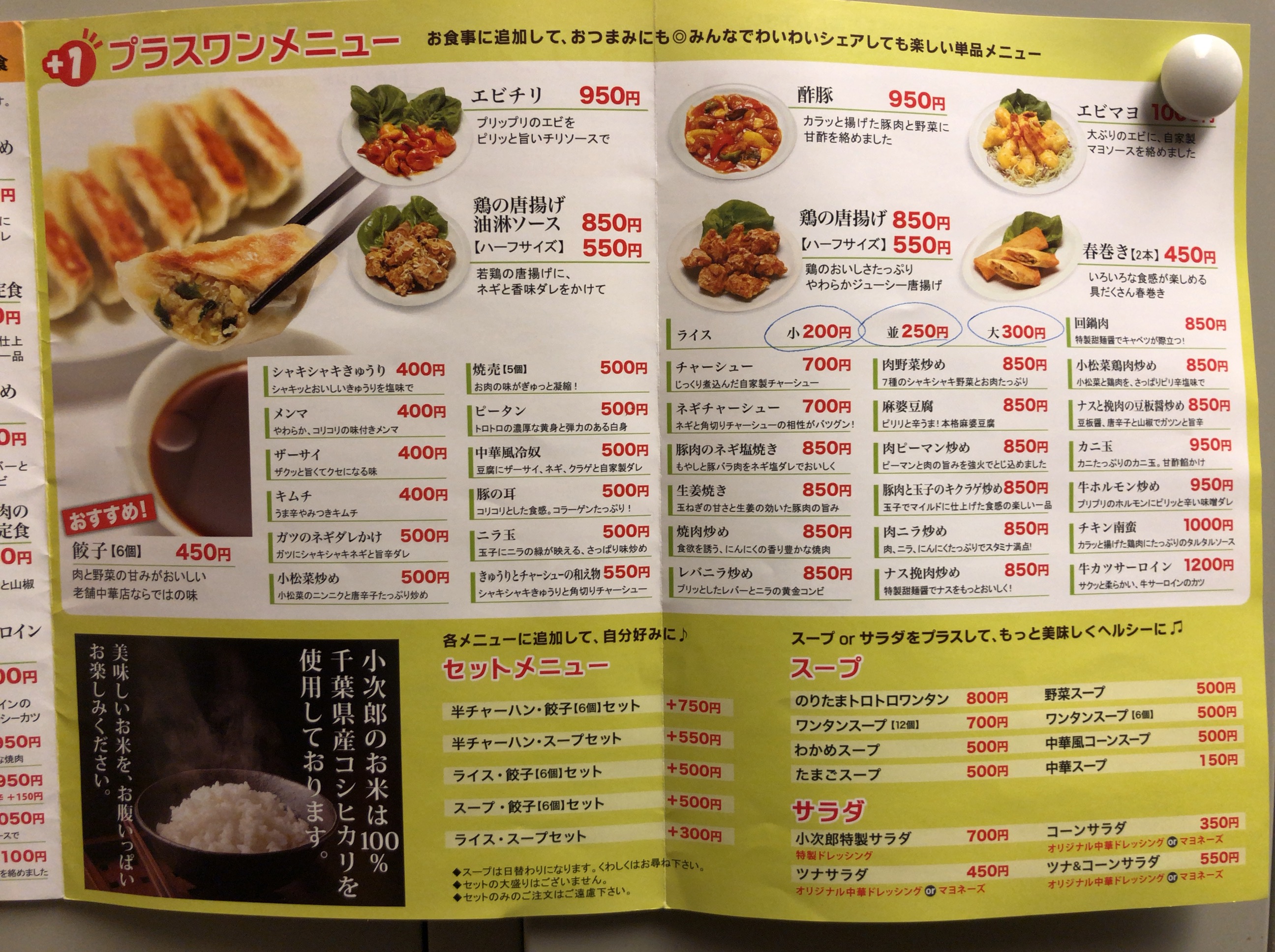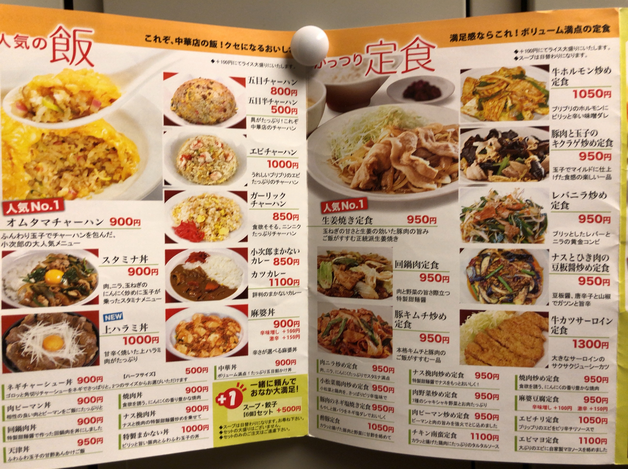 チャーハン系のご飯もの、定番中華おかずから生姜焼きまで色々ある定食。餃子や一品料理、つまみ系、スープも。